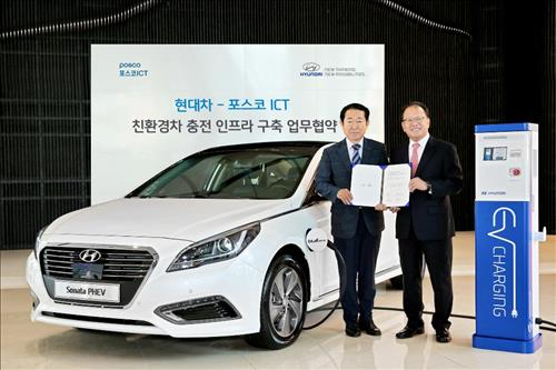 (서울=연합뉴스) 조재영 기자 = 현대자동차[005380]가 포스코ICT와 손잡고 플러그인 하이브리드차, 전기차 등 친환경차 충전 인프라 구축에 본격적으로 나선다.