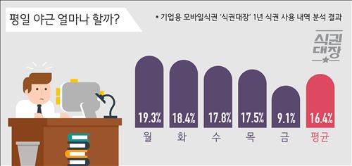 조사에 따르면 평일(월∼금)에 하루 평균 16.4%의 직장인이 석식 식권을 사용한 것으로 집계됐다.