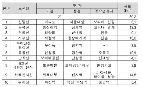 10개 노선은 ▲신림선(여의도∼서울대앞) ▲동북선(왕십리역∼상계역) ▲면목선(청량리∼신내동) ▲서부선(새절역∼장승배기역) ▲우이신설 연장선(우이동∼방학동) ▲목동선(신월동∼당산역) ▲난곡선(보라매공원∼난향동) ▲9호선 4단계 연장(보훈병원∼고덕강일1지구) ▲위례신사선(위례내부∼신사역) ▲위례선(마천역~복정·우남역) 등이다.