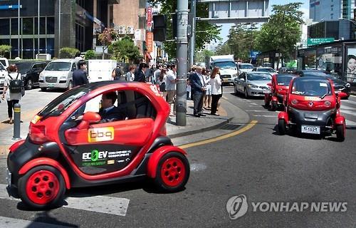 | △ 지난달 20일 초소형전기차 실증운행 업무협약식에서 참가자들이 트위지를 운행하고 있다. |