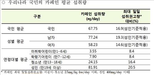 식약처가 2010∼2012년 국민건강영양조사 자료를 토대로 분석한 결과 카페인의 평균 일일섭취량은 성인(만19세 이상)이 81.9㎎으로 최대 일일섭취권고량의 20.5% 수준이었다.