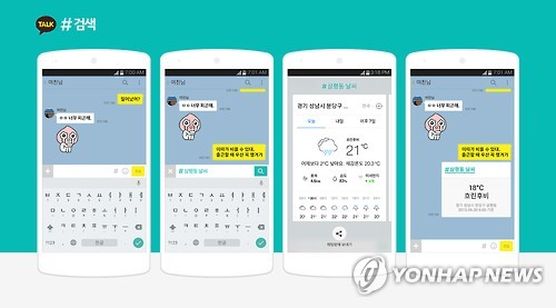 | △ (서울=연합뉴스) 다음카카오는 30일 카카오톡 '샵(#)검색'과 '채널' 서비스를 공식 출시하며 모바일 검색에 최적화된 '카카오검색'을 선보인다고 밝혔다. 사진은 이용자가 카카오톡에서 대화하다 궁금한 점이 있으면 채팅방에서 바로 검색해보고 친구에게 공유할 수 있는 기능인 샵검색. 2015.6.30. << 다음카카오 제공 >> photo@yna.co.kr |