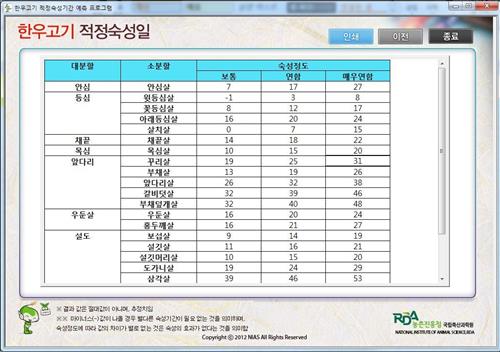 농진청은 이러한 숙성 기술을 산업 현장에서 쉽게 사용할 수 있도록 '한우고기 적정 숙성 기간 예측 프로그램'을 만들어 특허 등록했다.