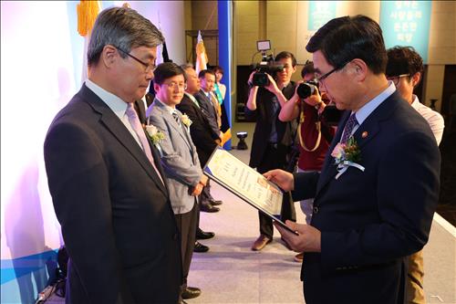 | △ 이기권 고용노동부 장관에게서 고용보험 기여 공로로 대통령 표창을 받는 근로복지공단 이재갑 이사장(왼쪽) |