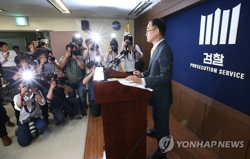 △ 관심집중 (서울=연합뉴스) 서명곤 기자 = 성완종 전 경남기업 회장의 정치권 금품제공 의혹을 수사한 검찰 특별수사팀 문무일 팀장(검사장)이 2일 서울 서초구 서초동 서울중앙지검에서 중간수사결과를 발표하고 있다.