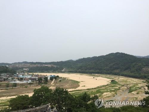 | △ (예천=연합뉴스) 이강일 기자 = 계속된 가뭄으로 경북 예천군 호명면 황지리 '도정서원' 앞을 흐르는 낙동강 지류 내성천이 바닥을 드러냈다. 2015.6.16 leeki@yna.co.kr (끝) |
