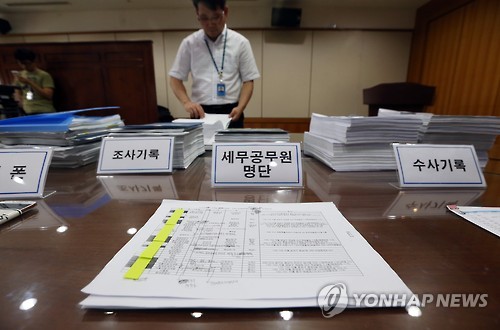 △ 국세청 공무원 뇌물수수 사건 수사결과 발표 (서울=연합뉴스) 신준희 기자 = 7일 오전 서울 서대문구 경찰청에서 지능범죄수사대 관계자가 국세청 공무원 뇌물수수 사건 수사기록과 압수물을 공개하고 있다. 경찰청 지능범죄수사대는 세무조사에서 편의를 제공하는 등 대가로 세무사로부터 뇌물을 받은 혐의로 국세청 공무원 10명과 세무사 등을 검거했다.