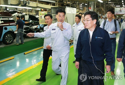 △ 카니발 생산라인 둘러보는 윤상직 장관 (서울=연합뉴스) 윤상직 산업통상자원부 장관이 10일 수도권 지역의 대표적인 수출 산업기지인 광명시 기아자동차 소하리 공장을 방문, 카니발 생산라인 현장을 둘러보고 있다. 2015.7.10 << 산업통상자원부 제공 >> photo@yna.co.kr