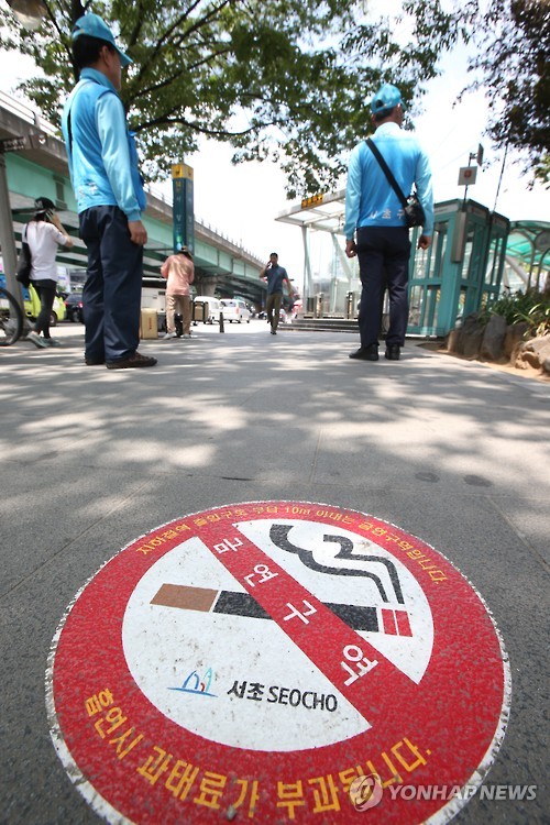 | △ '지하철역 주변 10m 이내에서는 금연' (서울=연합뉴스) 서명곤 기자 = 서초구가 모든 지하철역 출입구 주변 10m 이내를 금연구역으로 지정하고 단속에 들어간 1일 오전 서울 서초구 사당역 부근에서 단속원들이 단속활동을 벌이고 있다. 사당역, 고속터미널역, 교대역, 양재역, 남부터미널역 등 서초구 내 22개 지하철역 출입구 총 121곳이 금연구역이 됐으며 이곳에서 흡연 시 과태료 5만원이 부과된다. 2015.7.1 seephoto@yna.co.kr |