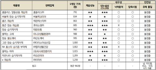 소비자원은 15일 소비자들이 많이 구입하는 습기제거제 12개 제품을 대상으로 제습 성능, 내구성, 안전성 등을 시험·평가한 결과를 발표했다.