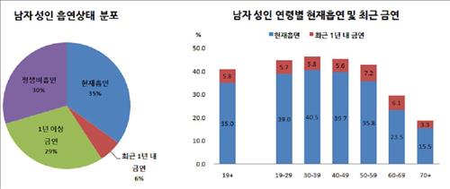 보건복지부는 한국갤럽에 의뢰해 5월27~6월10일 19세 이상 남녀 2천544명을 대상으로 전화조사(95% 신뢰수준에서 표본오차 ±1.94%)를 실시한 결과, 성인남성의 흡연율(궐련 담배 기준)이 작년 40.8%에서 5.8% 포인트 떨어진 35.0%인 것으로 나타났다고 15일 밝혔다.