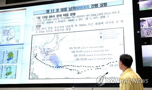 | △ 중앙재난안전상황실 모니터에 표시된 제11호 태풍 낭카 진행상황 (연합뉴스 자료사진) |