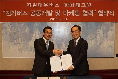 (서울=연합뉴스) 옥철 기자 = 한화테크윈[012450](대표이사 김철교)은 자일대우버스와 친환경 전기버스 공동 개발·마케팅 협약을 체결했다고 16일 밝혔다.