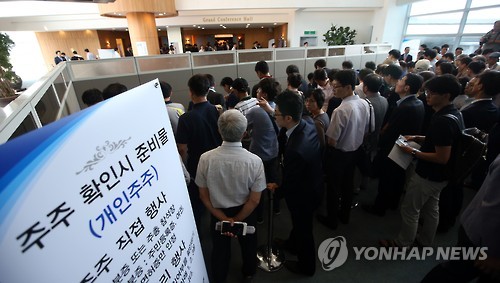 △ 삼성물산 임시 주주총회 (서울=연합뉴스) 박동주 기자 = 17일 오전 서울 양재동 aT센터에서 열린 삼성물산과 제일모직의 합병계약 안건을 주주 결의에 부치는 임시 주주총회에 앞서 주주들이 주주확인을 받고 있다.