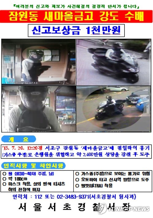 경찰, 잠원동 새마을금고 강도 현상금 1천만원