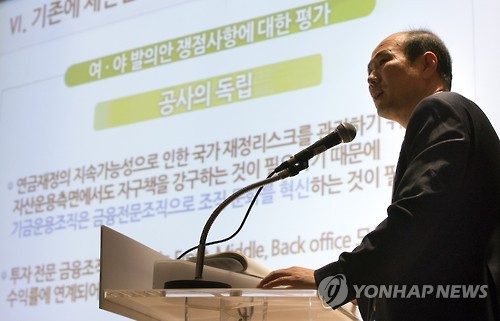 | △ 국민연금기금 관리·운용체계 개선방안 정책토론회 (서울=연합뉴스) 윤동진 기자 = 21일 오후 서울 여의도 한국화재보험협회 대강당에서 열린 국민연금기금 관리·운용체계 개선방안 정책토론회에서 원종욱 한국보건사회연구원 미래전략연구실 실장이 발제를 하고 있다. 이날 열린 토론회에서 한국보건사회연구원은 기금운용본부의 공사화, 기금운용위원회의 상설기구화, 국민연금정책위원회 위상과 전문성 강화 등 3가지를 핵심으로 하는 국민연금 지배구조 개편안을 발표했다. |