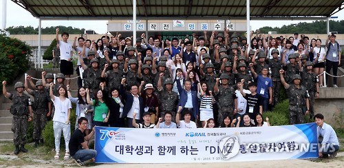 | △ 경원선 비무장지대(DMZ) 통일열차여행 (서울=연합뉴스) 행정자치부가 22일 대학생들과 함께하는 '경원선 비무장지대(DMZ) 통일열차여행' 행사를 개최한 가운데 강원도 철원군 소재 6사단 수색대대를 방문, 군장병들과 파이팅을 외치며 기념촬영을 하고 있다. (행정자치부 제공) |