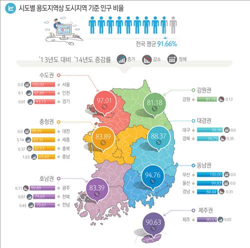 특히 도시지역에 거주하는 인구 비율은 작년(91.57%)보다 0.08%포인트 높았다. 이 비율은 2005년 90.11%로 처음 90%를 넘고 나서 증가세가 이어지고 있다.
