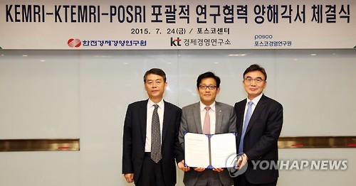 △ KT·포스코·한전, 에너지-ICT 융합 공동 연구 (서울=연합뉴스) 24일 서울 대치동 포스코센터에서 한전경제경영연구원 김락현 원장(왼쪽부터), KT경제경영연구소 박대수 소장, 포스코경영연구원 곽창호 원장이 -정보통신기술(ICT) 융합 연구 포럼을 운영하기로 하고 양해각서를 체결하고 있다. (KT 제공)