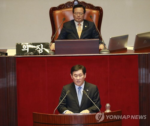 △ 정부측 의견 밝히는 최경환 부총리 (서울=연합뉴스) 이상학 기자 = 최경환 경제부총리 겸 기획재정부 장관이 24일 국회 본회의장에서 2015년도 제1회 추가경정예산안 등에 관한 정부측 의견을 밝히고 있다. leesh@yna.co.kr