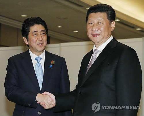 | △ 지난 4월 인도네시아 자카르타에서 열린 아시아 아프리카 정상회의에서 악수하는 시진핑 중국 국가주석(오른쪽)과 아베 신조 일본 총리. (AP=연합뉴스 자료사진) |
