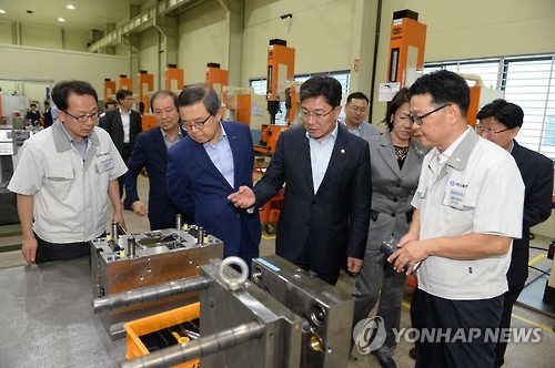 | △ 윤상직 산업통상자원부 장관이 지난 13일 경북창조경제혁신센터와 삼성전자 지원으로 스마트공장을 구축한 ㈜신흥정밀을 방문, 현장을 둘러보고 있다. (산업통상자원부 제공) |