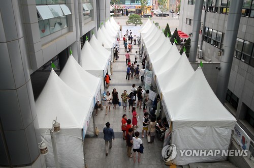 | △ (수원=연합뉴스) 최종호 기자 = 이달 7일 수원시청 별관 앞에서 열린 '2015 희망 여성 일자리박람회' 모습. 2015.7.7 zorba@yna.co.kr |