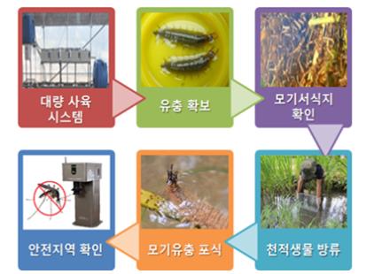 이 기술은 대량 사육 장비로 확보한 잔물땡땡이 유충을 모기가 대량 발생하는 지역에 방류해 모기 유충을 잡아먹도록 하는 방법이다.