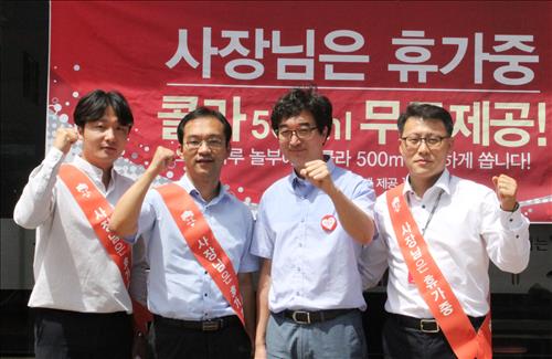 '사장님은 휴가중'인 매장에 방문하는 고객에게는 테이블당 음료를 공짜로 제공한다. 본사가 이 비용을 전액 부담한다.