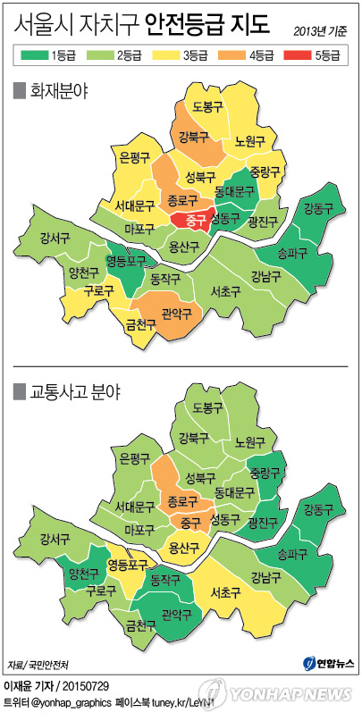 한편, 강동구와 송파구는 화재 분야와 교통사고 분야에서 모두 1등급을 받아 다른 자치구에 비해 안전 수준이 높았다고 안전처는 설명했다.