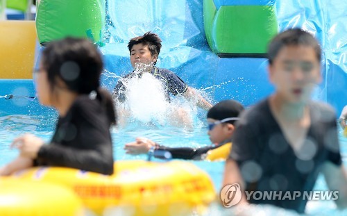 | △ '더위야 비켜라' (대구=연합뉴스) 김준범 기자 = 무더운 날씨를 보인 28일 오후 대구 대봉교 신천 물놀이장을 찾은 학생들이 놀이기구를 타며 즐거운 시간을 보내고 있다. 2015.7.28 psykims@yna.co.kr |