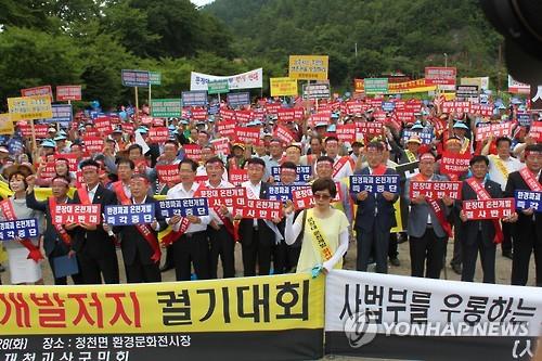 | △ (괴산=연합뉴스) 변우열 기자 = 지난달 28일 오후 충북 괴산군 청천면 청천 환경문화전시장에서 '문장대온천 개발저지 충북 범도민대책위원회 출범식'과 충북도민 궐기대회가 열렸다. 참석자들이 문장대 온천개발 중단을 요구했다. |
