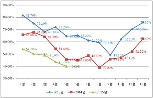 3일 전력거래소 등에 따르면 지난 5월 기준 LNG 발전소 가동률은 40%로 2년 전인 2013년 5월의 64.6%와 비교하면 25%포인트 가량 떨어졌다.
