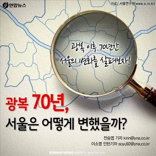 (서울=연합뉴스) 전승엽 기자·이소영 인턴기자 = 서울시 산하 연구기관인 서울연구원이 광복 이후 70년간 서울의 변화상을 인포그래픽으로 정리했다. 이중 일부를 간추려 카드뉴스로 소개한다.