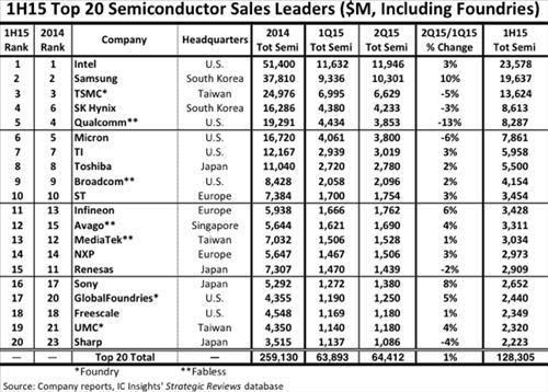 IC인사이츠는 2014년 매출 실적에서는 인텔이 삼성보다 36%나 많았는데 올해 2분기에는 격차를 무려 20%포인트나 줄여 삼성이 인텔을 16% 차이로 추격하고 있다고 분석했다.