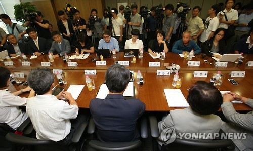 △ 지난달 23일 서울 서대문구 법무법인 지평 회의실에서 열린 삼성전자 반도체 공장 근로자 직업병 보상 등에 대한 조정안 발표. (연합뉴스 자료사진)