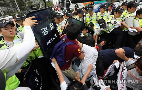 △ 서울중앙지검 공안2부(김신 부장검사)는 '국정원 규탄' 불법 집회를 주최한 혐의(집회 및 시위에 관한 법률 위반)로 21세기한국대학생연합(한대련) 전 의장 김모(26·여)씨를 불구속 기소했다고 11일 밝혔다. 사진은 지난 2013년 6월 당시 '국정원 규탄' 불법 집회 모습. (연합뉴스 자료사진)