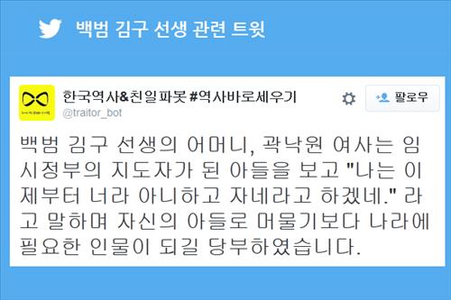 특히 최근에는 김구 선생의 모친인 곽낙원 여사가 아들에게 남긴 당부나 대한민국 임시정부에서 민족의 처단 대상으로 공표한 '칠가살' 관련 내용이 트윗되며 누리꾼들의 주목을 받았다.