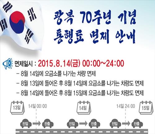 여형구 국토부 차관은 "광복 70주년을 맞아 국민 사기 진작과 경기 활성화를 위해 고속도로 통행료를 면제하는 만큼 교통소통과 안전관리에 최선을 다하겠다"고 밝혔다.