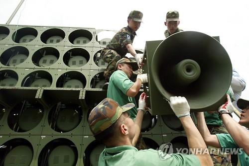 △ 남북장성급군사회담 부속합의서에 따라 2004년 6월16일 서부전선 무력부대 오두산전망대에서 군인들이 대북선전용 대형확성기를 철거하는 모습(연합뉴스 자료사진)