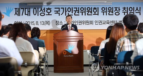 △ 취임사 하는 이성호 신임 국가인권위원장 (서울=연합뉴스) 박동주 기자 = 이성호 신임 국가인권위원장이 13일 오후 서울 중구 인권위에서 열린 취임식에서 취임사를 하고 있다. 2015.8.13 pdj6635@yna.co.kr