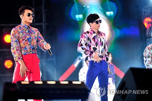 △ 멋진 무대 선보이는 유재석과 박진영 (평창=연합뉴스) 13일 오후 강원도 평창 알펜시아 스키 점프대 앞 광장에서 열린 '2015 무한도전 영동고속도로 가요제'에서 개그맨 유재석과 가수 박진영이 멋진 무대를 선보이고 있다. ( MBC 제공 )