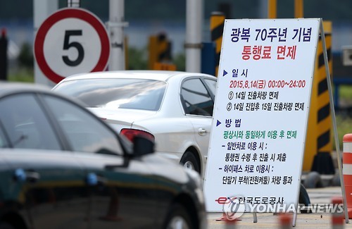 (세종=연합뉴스) 성혜미 기자 = 광복 70주년을 맞아 임시휴일로 지정된 14일 하루 동안 전국 주요 고속도로를 이용한 차량은 518만대, 면제된 통행료는 141억원에 이르는 것으로 나타났다.
