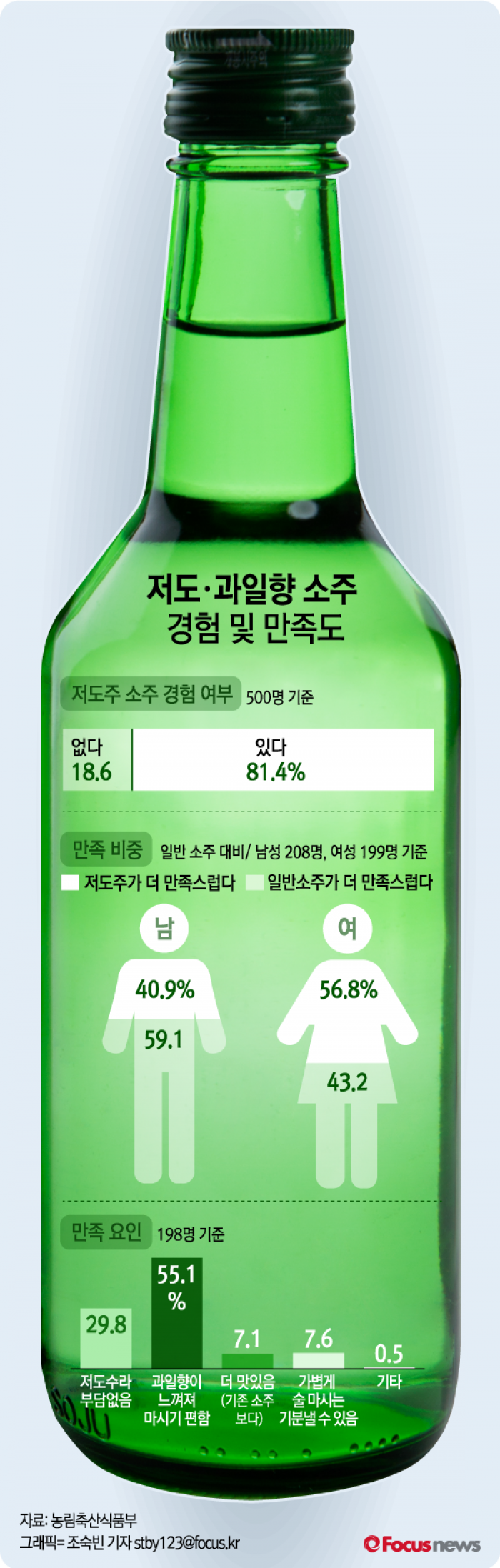 특히 저도·과일향 소주를 경험한 응답자 비중이 81.4%로 매우 높게 나타났다. 남성 40.9%에 비해 여성 56.8%가 저도주에 대한 만족도가 더 높았다. 만족 요인으로는 ‘과일향이 느껴져 마시기 편함’이 55.1%로 가장 많았다.