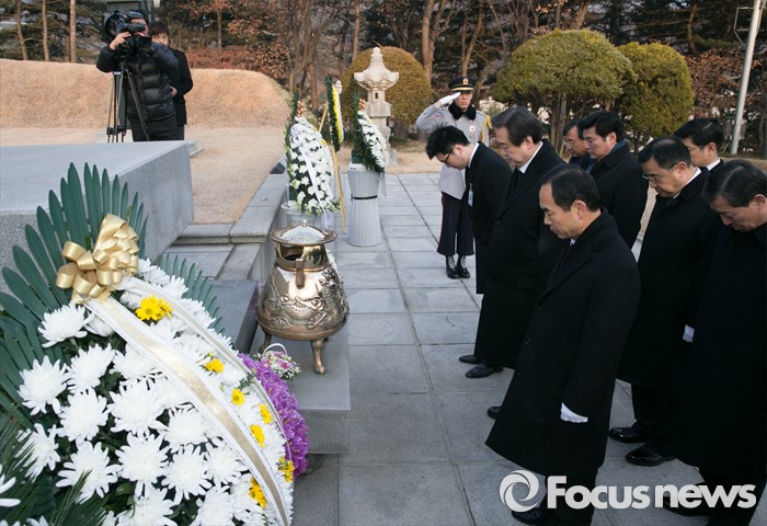 (서울=포커스뉴스) 병신년(丙申年) 새해 첫 날인 1일 오전 동작구 국립서울현충원에서 김무성 새누리당 대표 등 지도부가 이승만 전 대통령 묘역 참배를 하고 있다.