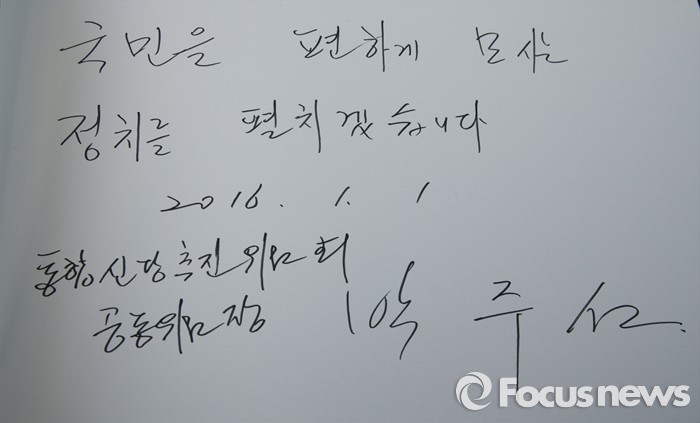 (서울=포커스뉴스) 병신년(丙申年) 새해 첫 날인 1일 오전 동작구 국립서울현충원에서 통합신당 창당을 준비 중인 박주선 무소속 의원이 현충탑 참배를 했다. 사진은 박 의원이 남긴 방명록.