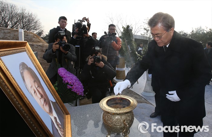 (서울=포커스뉴스) 병신년(丙申年) 새해 첫 날인 1일 오전 동작구 국립서울현충원에서 문재인 더불어민주당 대표 등 의원들이 김영삼 전 대통령 묘역 참배를 하고 있다.