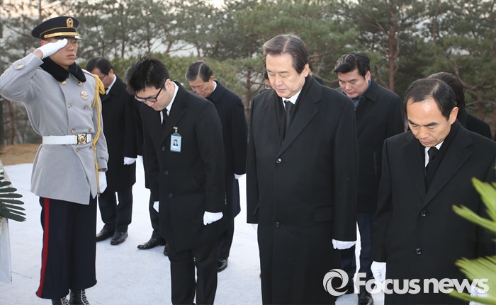 (서울=포커스뉴스) 병신년(丙申年) 새해 첫 날인 1일 오전 동작구 국립서울현충원에서 김무성 새누리당 대표 등 지도부가 김영삼 전 대통령 묘역 참배를 하고 있다.
