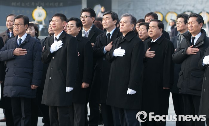 (서울=포커스뉴스) 병신년(丙申年) 새해 첫 날인 1일 오전 동작구 국립서울현충원에서 문재인 더불어민주당 대표 등 의원들이 현충탑 참배를 마친 뒤 이동하며 국기에 대한 경례를 하고 있다.