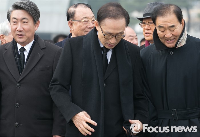 (서울=포커스뉴스) 병신년(丙申年) 새해 첫 날인 1일 오전 동작구 국립서울현충원에서 현충탑 참배를 마친 이명박(가운데) 전 대통령과 이재오(오른쪽) 새누리당 의원이 대화하고 있다. 왼쪽은 이동관 전 홍보수석.
